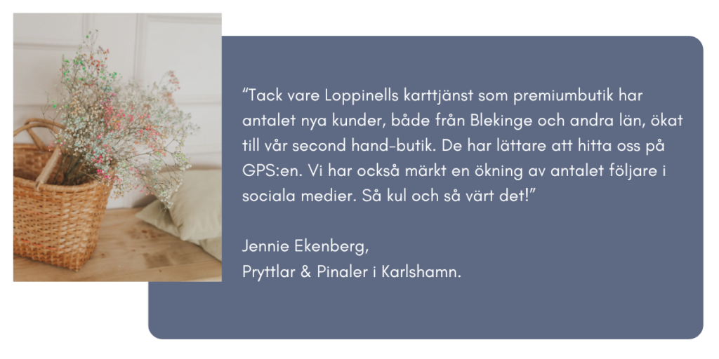 ”Äntligen en smidig app där vi hamnat på kartan som både onlineloppis och fysisk butik! Fler hittar till oss, vet när vi har öppet och kan planera sina loppisturer tack vare Loppinell. På samma ställe har kunderna sina loppislistor redo och vet därför vad de söker. Vi märker att fler även hittar till vår webbshop som inte kan ta sig till den fysiska butiken. Alla borde använda Loppinell.”